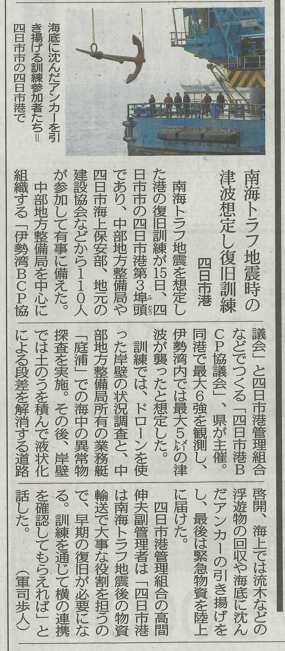 「南海トラフ地震を想定した港の復旧訓練」があり、当社も参加しました(2月16日中日新聞三重総合(9)掲載)